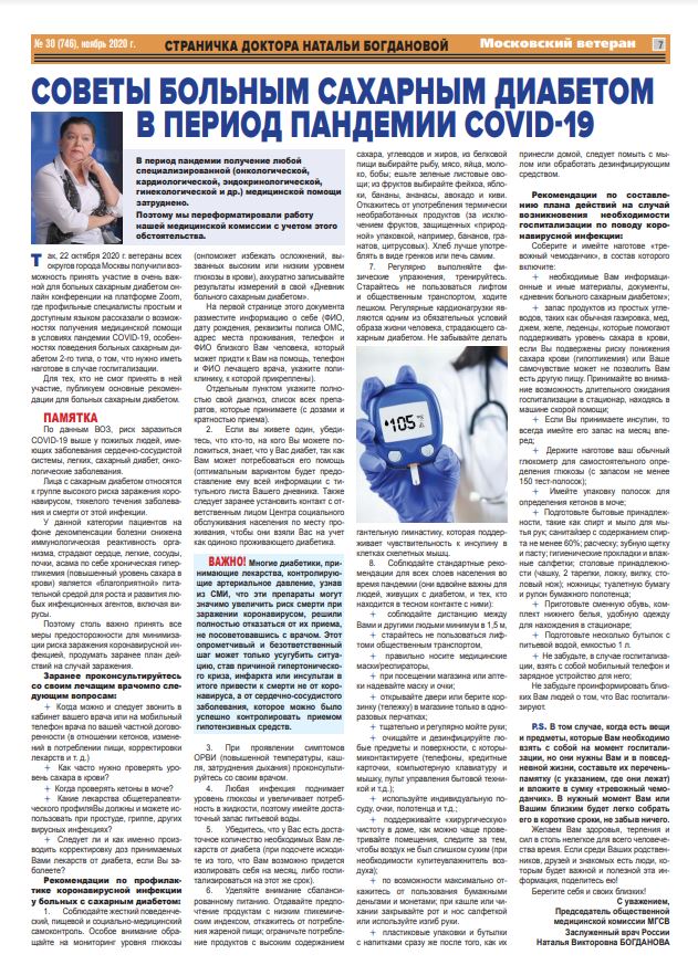 Газета «Московский ветеран». Страница доктора Н. Богдановой «СОВЕТЫ БОЛЬНЫМ САХАРНЫМ ДИАБЕТОМ В ПЕРИОД ПАНДЕМИИ COVID-19»