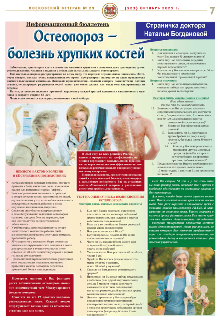 Информационный бюллетень. Газета «Московский ветеран». Статья Богдановой Н. В. «Остеопороз — болезнь хрупких костей»