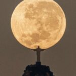 Снимок сделан бразильским фотографом Леонардо Сенсом 4 июня 2023 года. Чтобы добиться совпадения размеров совсем небольшой на небе Луны и колоссальной 98-футовой статуи, ему пришлось делать фотографию с расстояния более 10 км — такой маленькой должна была выглядеть статуя.